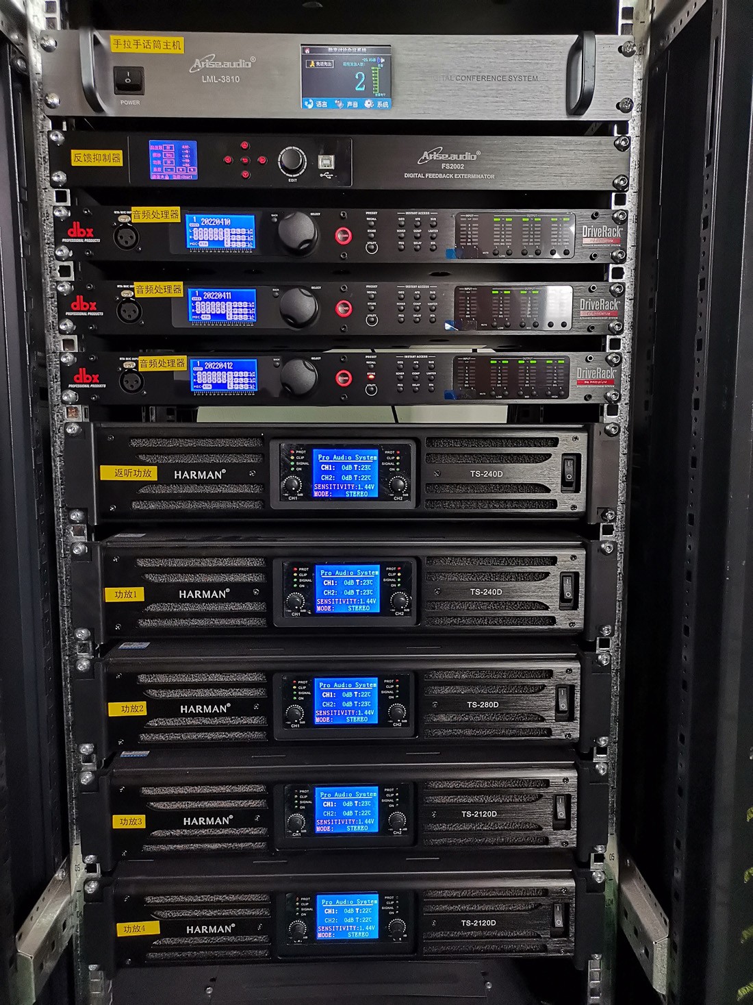 線性陣列中遠程集中式發聲,減少多點反射帶來的聲音亂雜(語音清晰度)。分段式擴聲朝向近處午夜成人福利在线观看聲音小,朝越遠聲音逐漸加大。聲音有方向感,中遠程覆蓋麵廣,前後排觀眾聽到聲音一樣大(聲場均勻度)。音響設備全係列HARMAN哈曼品牌。