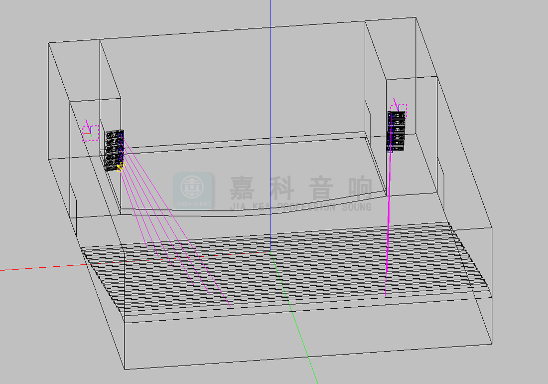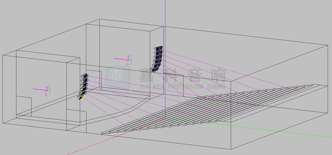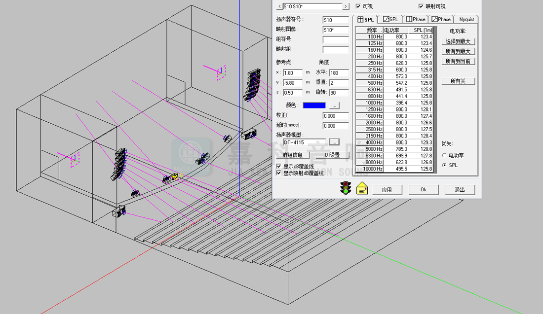 通過初步的設計計算確定午夜成人福利在线观看的數量和分布,午夜精品视频這裏選用百威老字號品牌和設備清單上的型號。使用國際聲場模擬測試軟件EASE建立數學模型,將所選的午夜成人福利在线观看參數功率代入模型,通過聲場設計軟件,模擬計算相關聲學參數。根據行業標準測試結果令人滿意,聲場聲壓與聲場清晰度的測試結果均優良。
