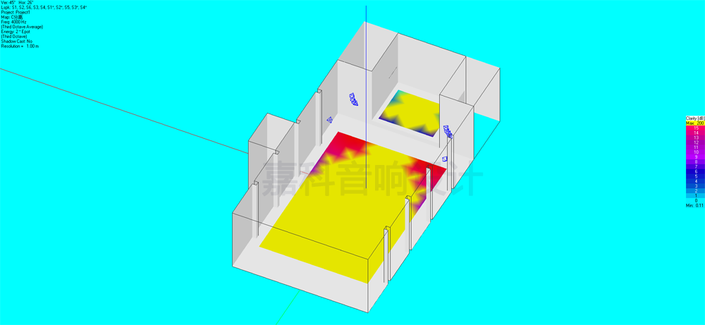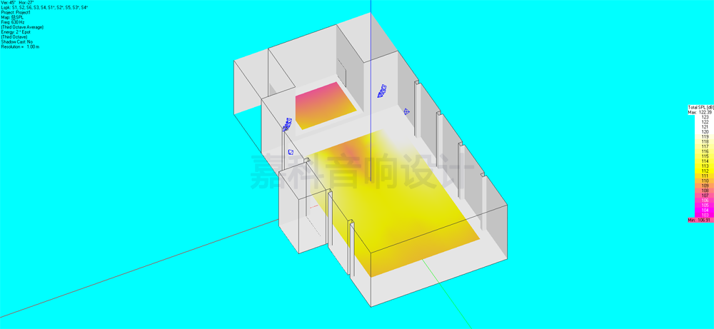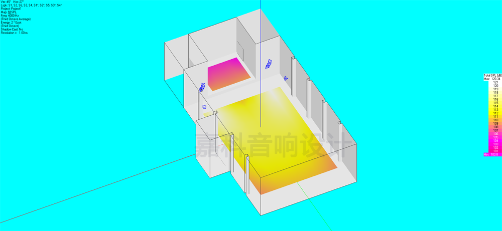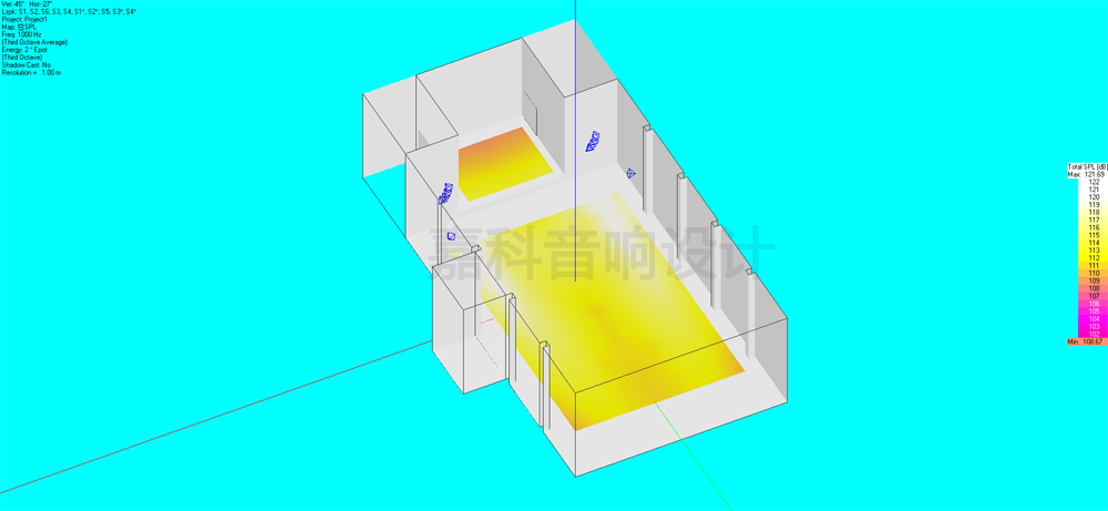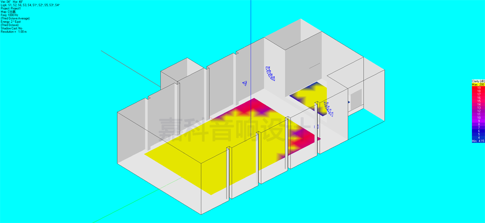 通過初步的設計計算確定午夜成人福利在线观看的數量和分布,午夜精品视频這裏選用百威老字號品牌和設備清單上的型號。使用國際聲場模擬測試軟件EASE建立數學模型,將所選的午夜成人福利在线观看參數功率代入模型,通過聲場設計軟件,模擬計算相關聲學參數。根據行業標準測試結果令人滿意,聲場聲壓與聲場清晰度的測試結果均優良。