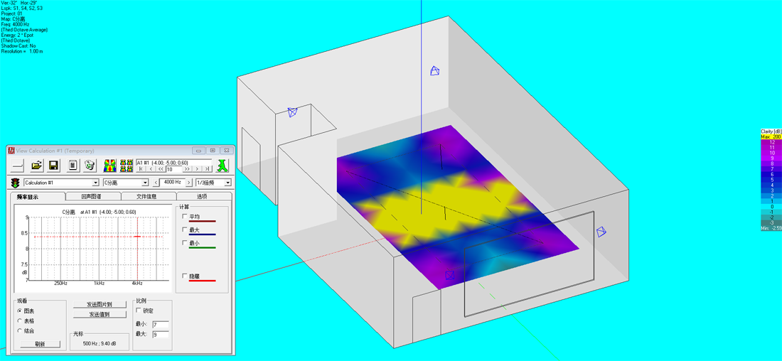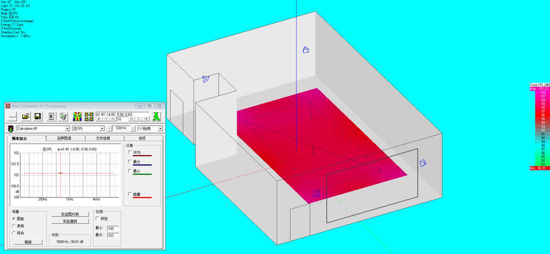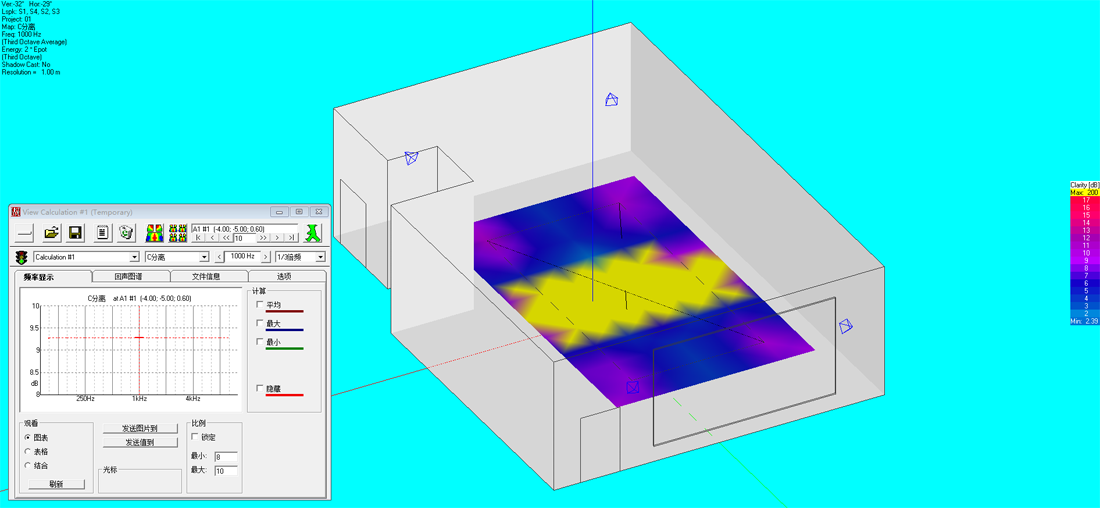 通過初步的設計計算確定午夜成人福利在线观看的數量和分布,午夜精品视频這裏選用百威老字號品牌和設備清單上的型號。使用國際聲場模擬測試軟件EASE建立數學模型,將所選的午夜成人福利在线观看參數功率代入模型,通過聲場設計軟件,模擬計算相關聲學參數。根據行業標準測試結果令人滿意,聲場聲壓與聲場清晰度的測試結果均優良。