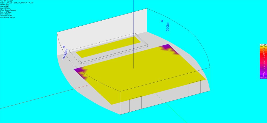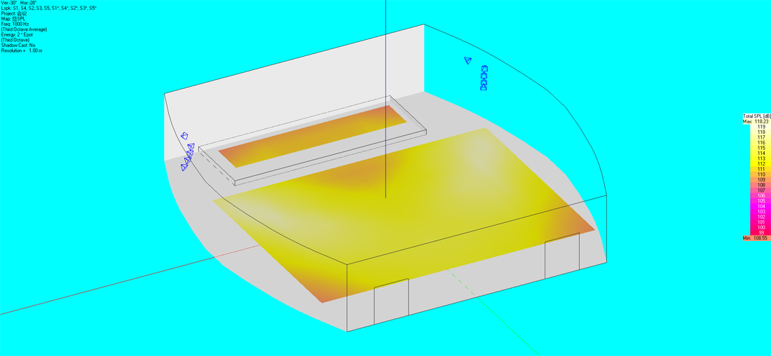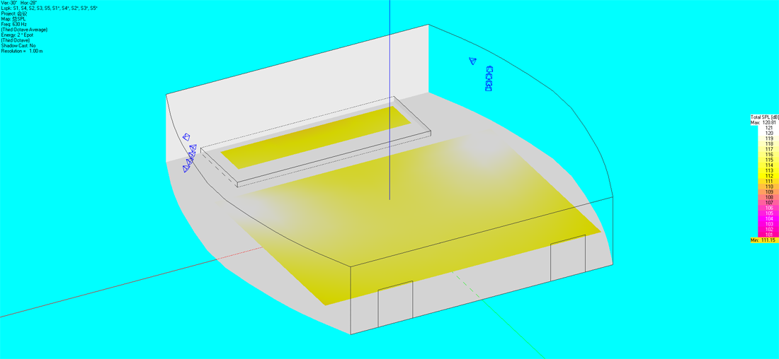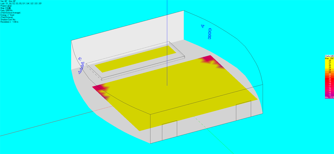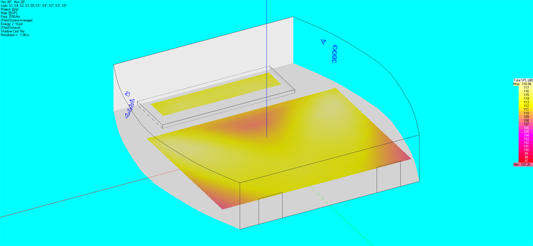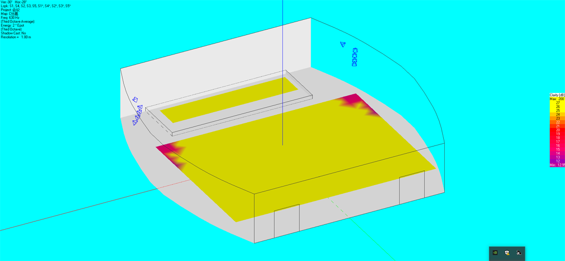 通過初步的設計計算確定午夜成人福利在线观看的數量和分布,午夜精品视频這裏選用百威老字號品牌和設備清單上的型號。使用國際聲場模擬測試軟件EASE建立數學模型,將所選的午夜成人福利在线观看參數功率代入模型,通過聲場設計軟件,模擬計算相關聲學參數。根據行業標準測試結果令人滿意,聲場聲壓與聲場清晰度的測試結果均優良。